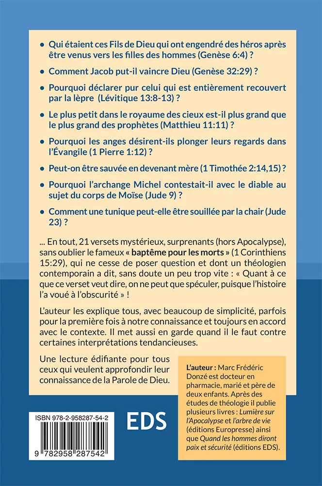 L’auteur explore 21 versets bibliques parmi les plus mystérieux — en dehors de l’Apocalypse — souvent négligés ou mal compris. De Genèse à Jude, il apporte des explications claires et contextuelles, sans jamais forcer le sens du texte, et met aussi en garde quand il le faut contre certaines interprétations tendancieuses.