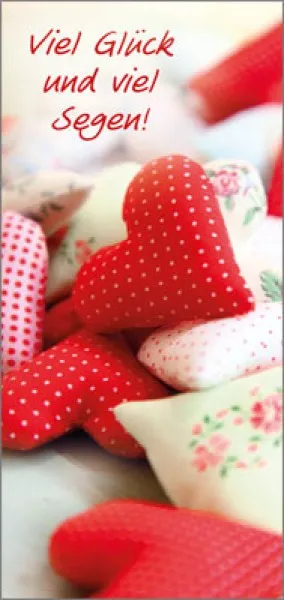 Magnet-Lesezeichen mit dem Bildmotiv rote Stoffherzen Formschöne Magnetlesezeichen Format 9,5 x 4,5 cm hochwertiges Kartonpapier farbiger Fotohochglanz-Druck 2 Magnete um das Lesezeichen rutschfest einzulegen Text : Viel Glück und viel Segen !