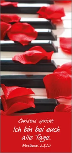 Magnet-Lesezeichen mit dem Bildmotiv Klaviertasten und rote Rosenblätter Formschöne Magnetlesezeichen# Format 9,5 x 4,5 cm hochwertiges Kartonpapier farbiger Fotohochglanz-Druck 2 Magnete um das Lesezeichen rutschfest einzulegen Bibelvers Matthäus 28,20