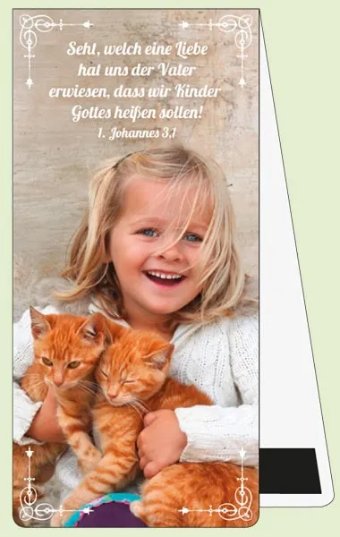 Magnet-Lesezeichen mit Kinder- und Tiermotiv plus Bibeltext formschönes Magnetlesezeichen Format 9,5 x 4,5 cm hochwertiges Kartonpapier farbiger Fotohochglanz-Druck 2 Magnete um das Lesezeichen rutschfest einzulegen Bibeltext aus 1. Johannes 3,1 : Seht, welch eine Liebe hat uns der Vater erwiesen, dass wir Kinder Gottes heissen sollen !