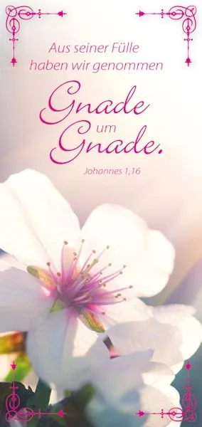 Magnetlesezeichen mit Bildmotiv und Text formschönes Magnetlesezeichen Format 9,5 x 4,5 cm hochwertiges Kartonpapier farbiger Fotohochglanz-Druck 2 Magnete um das Lesezeichen rutschfest einzulegen Bibeltext aus Johannes 1,16 : Aus seiner Fülle haben wir genommen Gnade um Gnade.